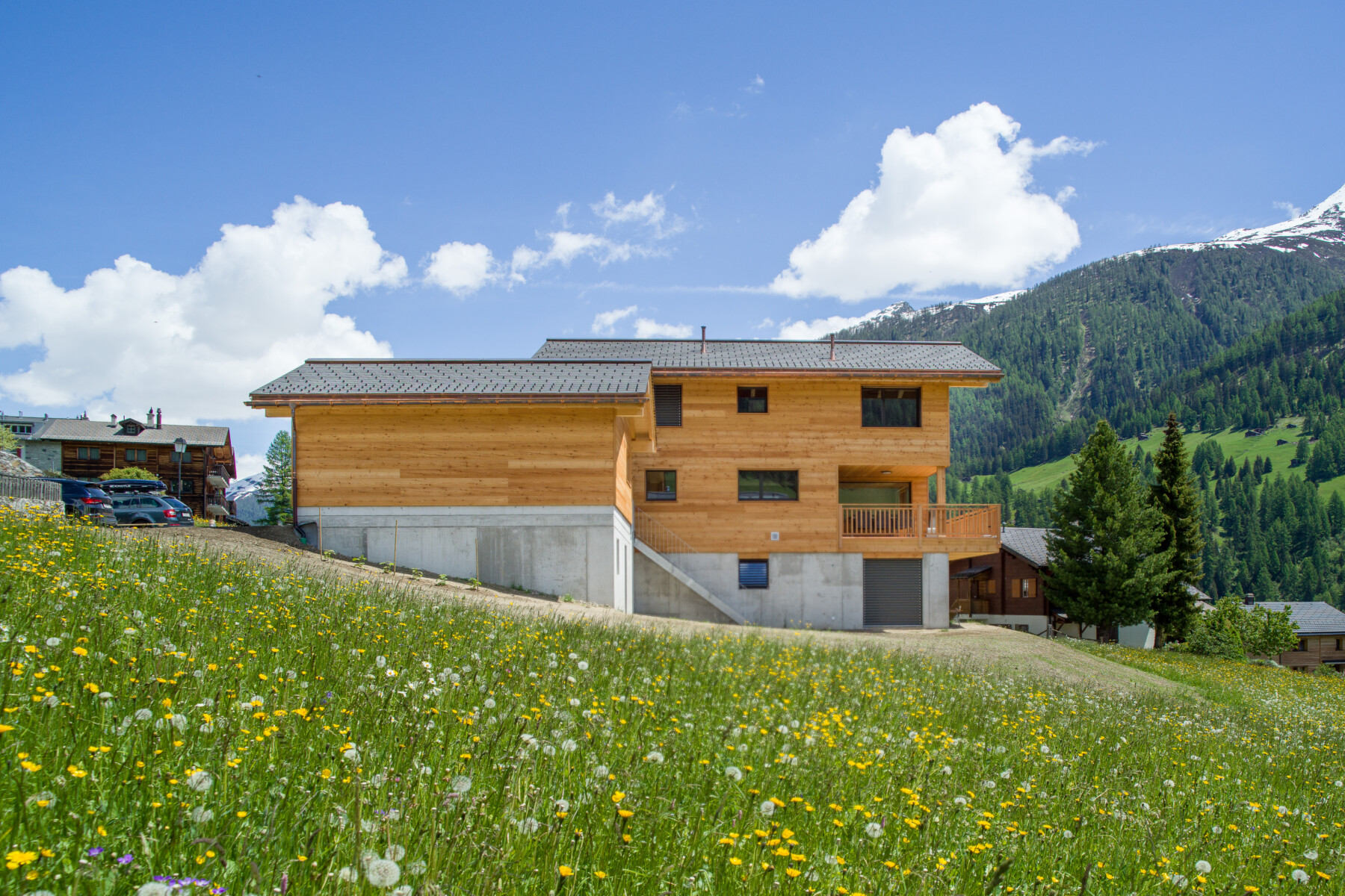 Betonmauerwerk, Aussenschalung Lärche, Innenausbau Fichte - Eiche massiv und furniert, Linoleum Desktop