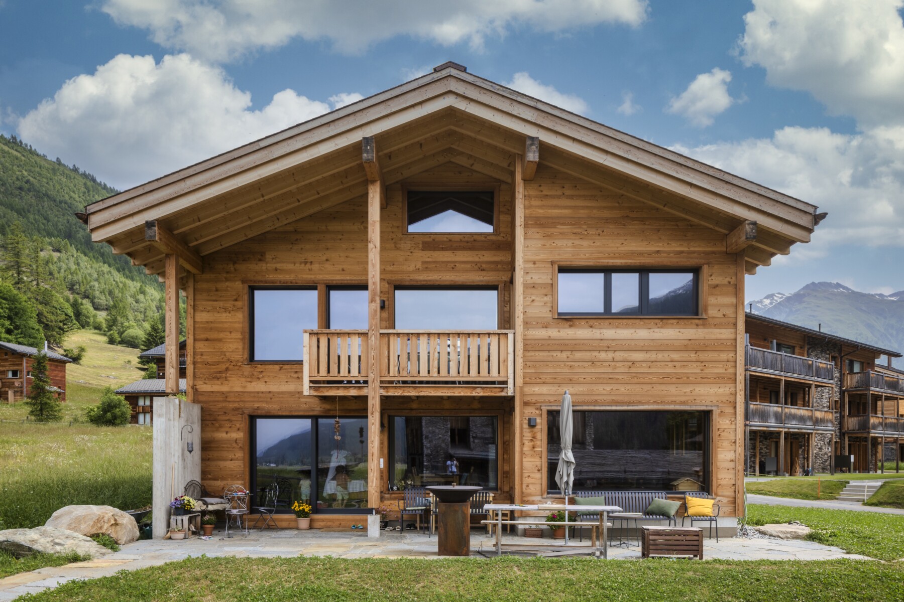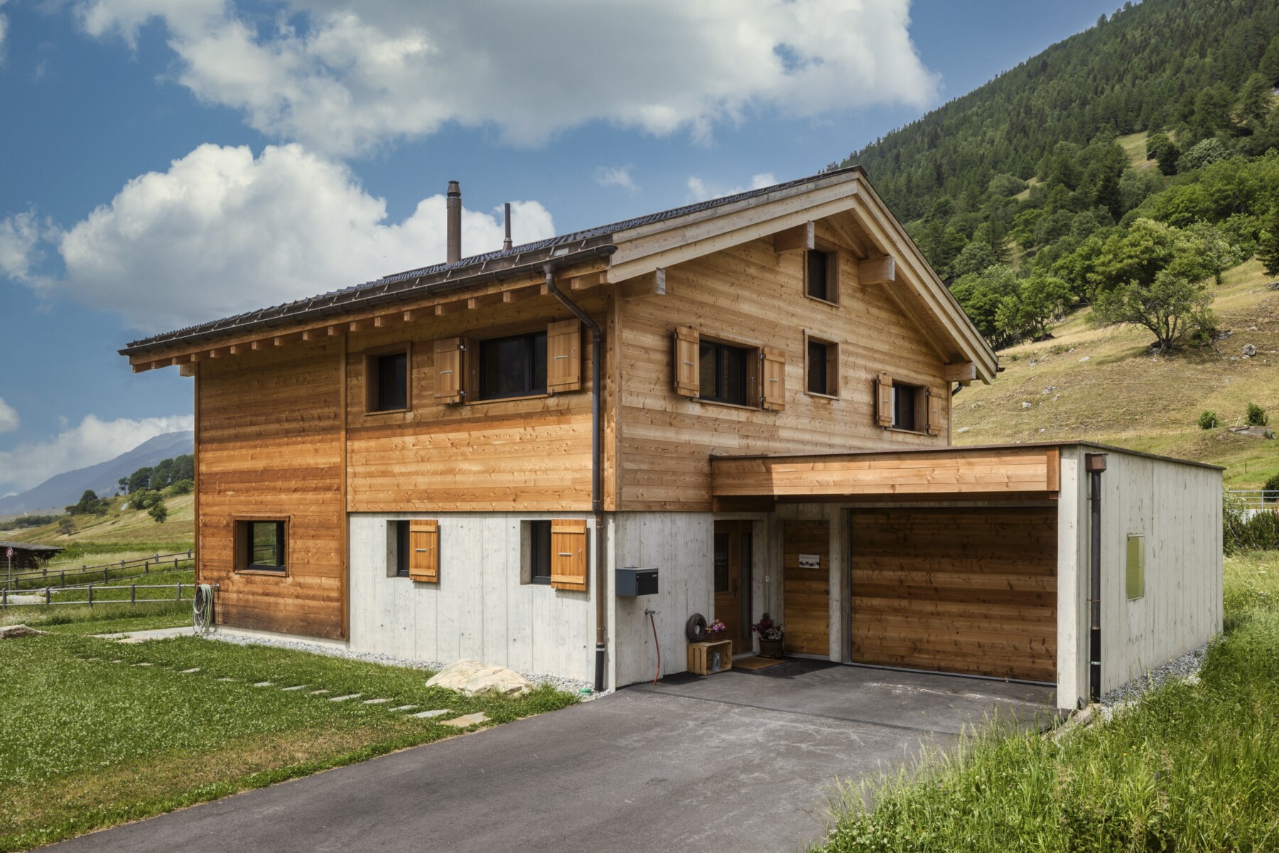 Betonmauerwerk, Aussenschalung Lärche, Innenausbau Fichte - Arve massiv