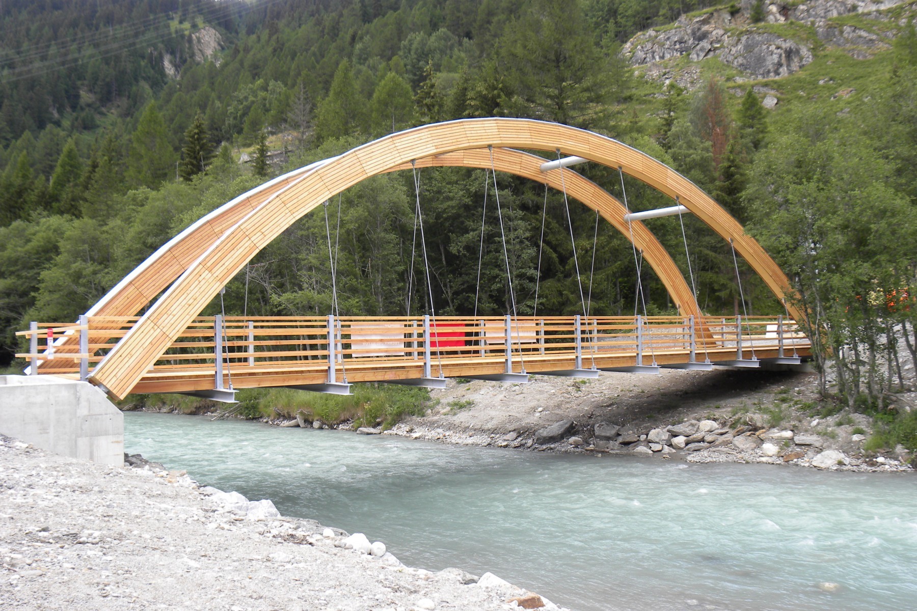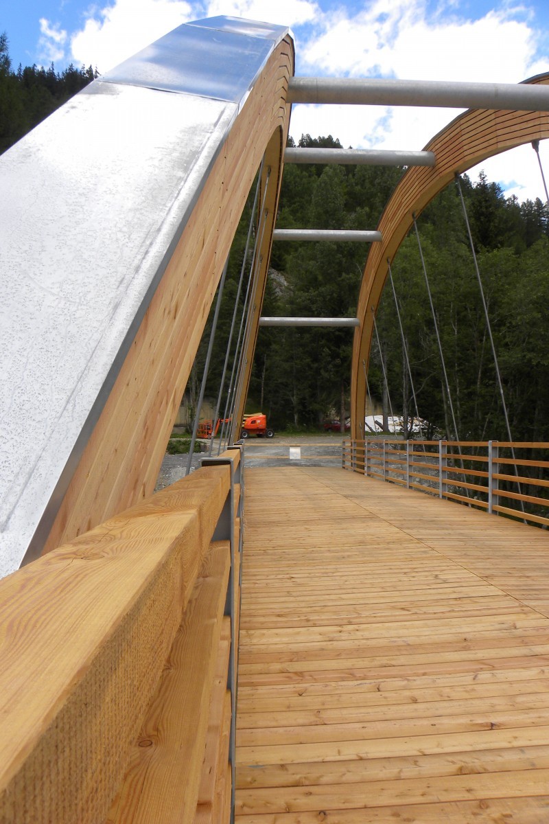 Die Fussgänger- und Loipenbrücke führt über die junge Rhone in Oberwald. Sie verbindet das Loipennetz gegen den „Pischewald“ und gewährt den Fussgänger im Sommer neue Erkundungswege. Die freitragende Bodenbrücke ist auf 36 m1 Spannweite konzipiert. Die Bogenträger in Fichtenholz BSH in Kombination mit Stahlträger verleiht der Brücke eine gewisse Fragilität. Die gesamte Konstruktion wurde mit zwei Autokränen auf die vorbereiteten Wiederlager in Stahlbeton in einem Arbeitsgang versetzt. Der Brückenboden und das Geländer sind in Lärchenholz gehalten. Die Bogenbinder sind zum Schutz mit einer liegenden Romboidschalung in Lärche verkleidet.