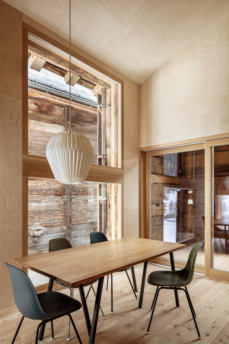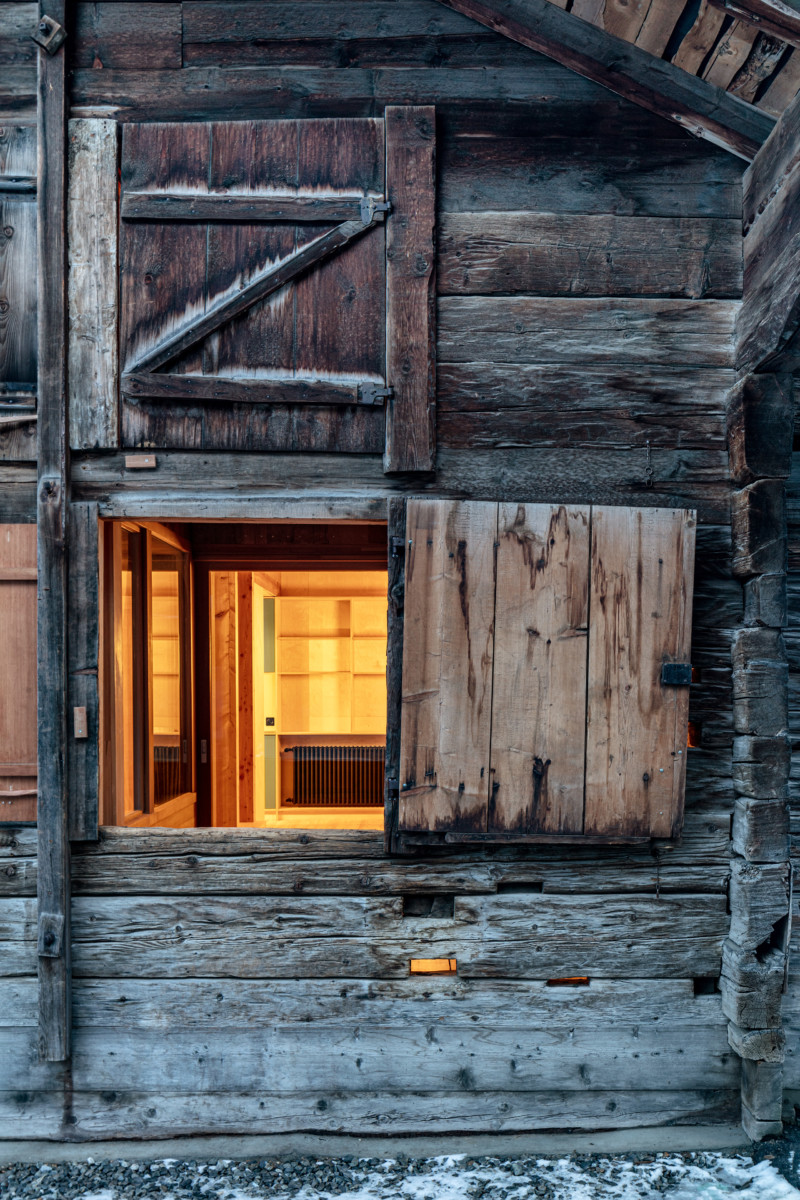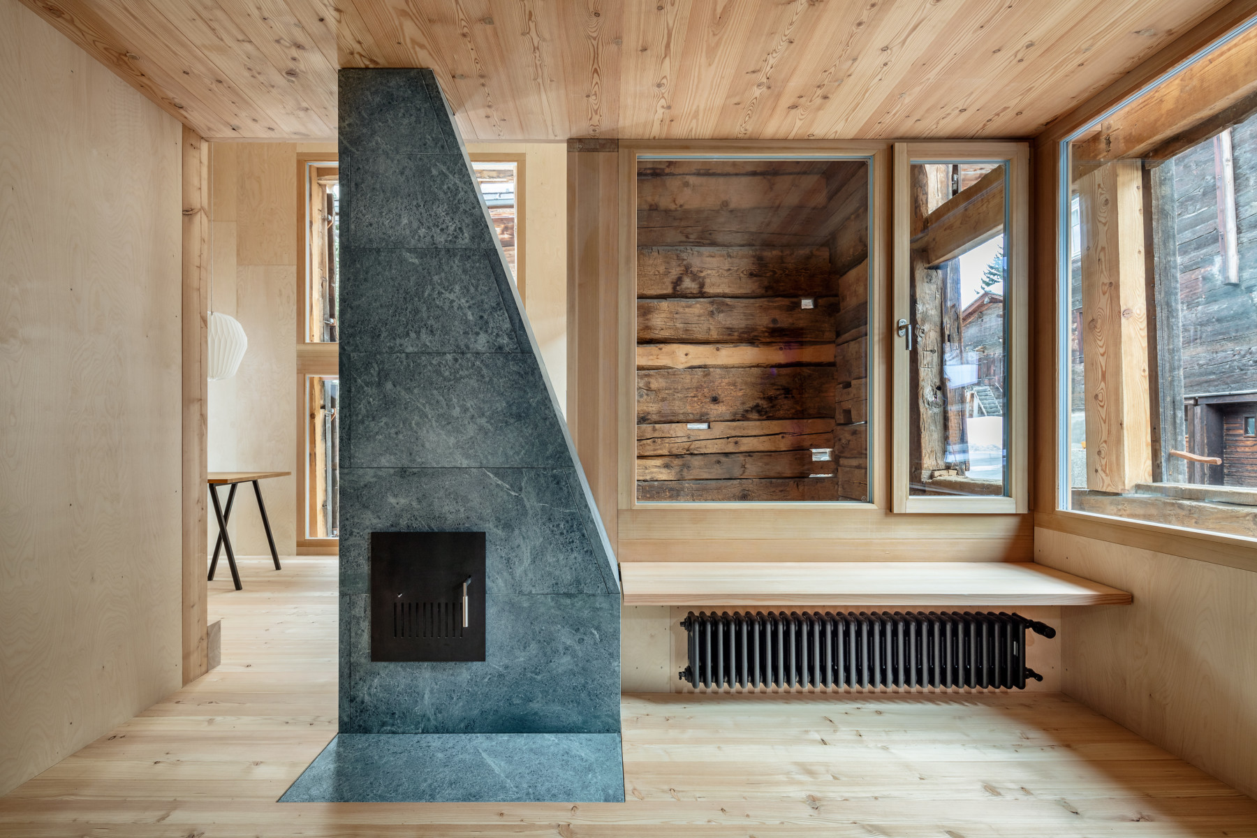 Die Doppel-Stallscheune liegt in Gluringen, in einem typischen Dorf im Hochtal Goms. Der alte Blockholzbau wurde mit einem Wohnblockteil im Heuraum-Geschoss ergänzt und kann neu als Wohnhaus genutzt werden. Der Haupteingang ist über die «Schir-Aussentreppe» erreichbar und bildet in einem kleinen Vorraum, der ursprünglich ist, einen kleinen Entréebereich. Der neu eingebaute Bauteil wurde in Holzbauweise umgesetzt. Als Kontrast zu der alten Blockwand in Lärche/Fichte wurden die Wände und Decken einheitlich mit edelfurniertem Birkensperrholz verkleidet. Die Böden sind mit einheimischen Lärchenriemen gefertigt. Das Dach wurde mit Mithilfe der Eigentümer mit handgespaltenen Lärchenschindeln eingedeckt. Sämtliche Oberflächen sind unbehandelt.