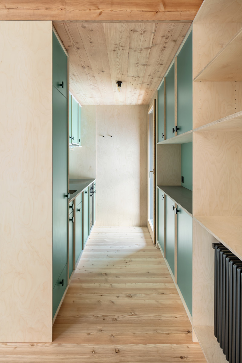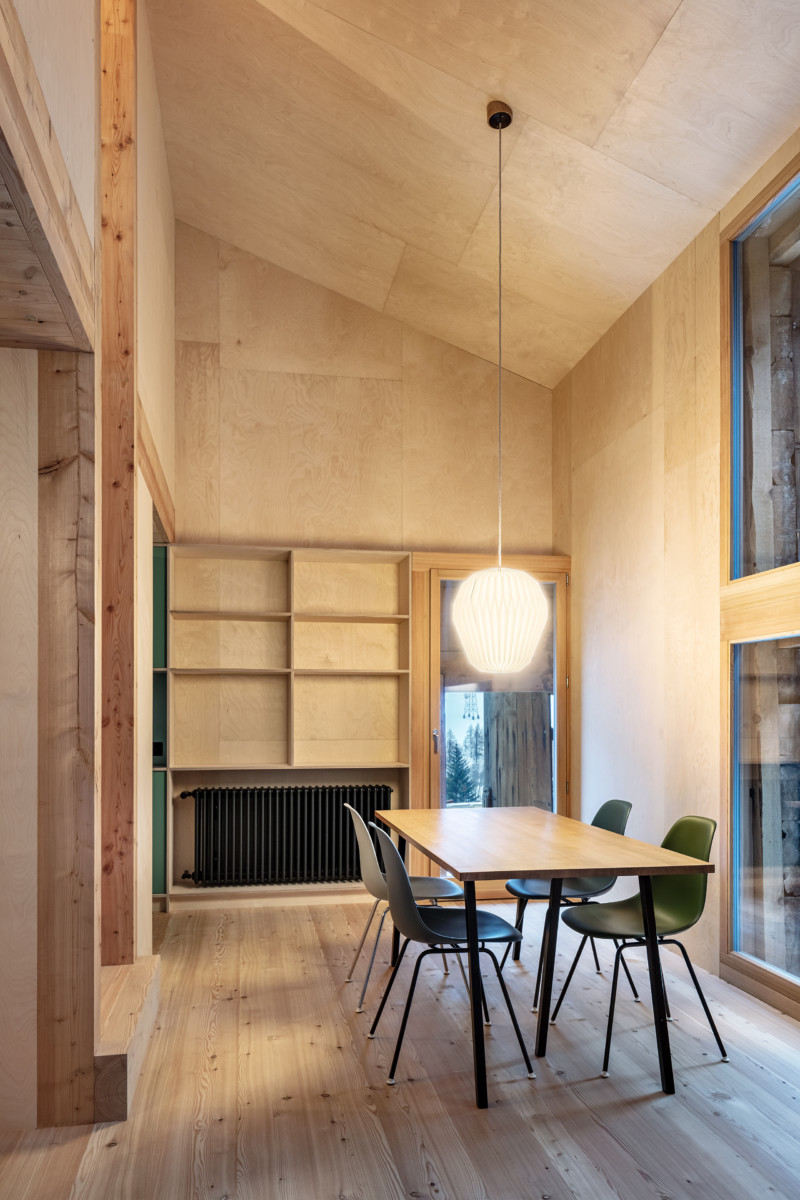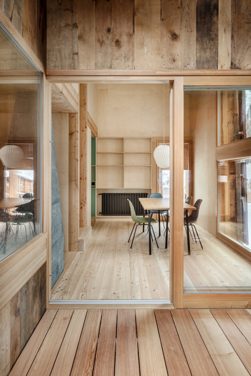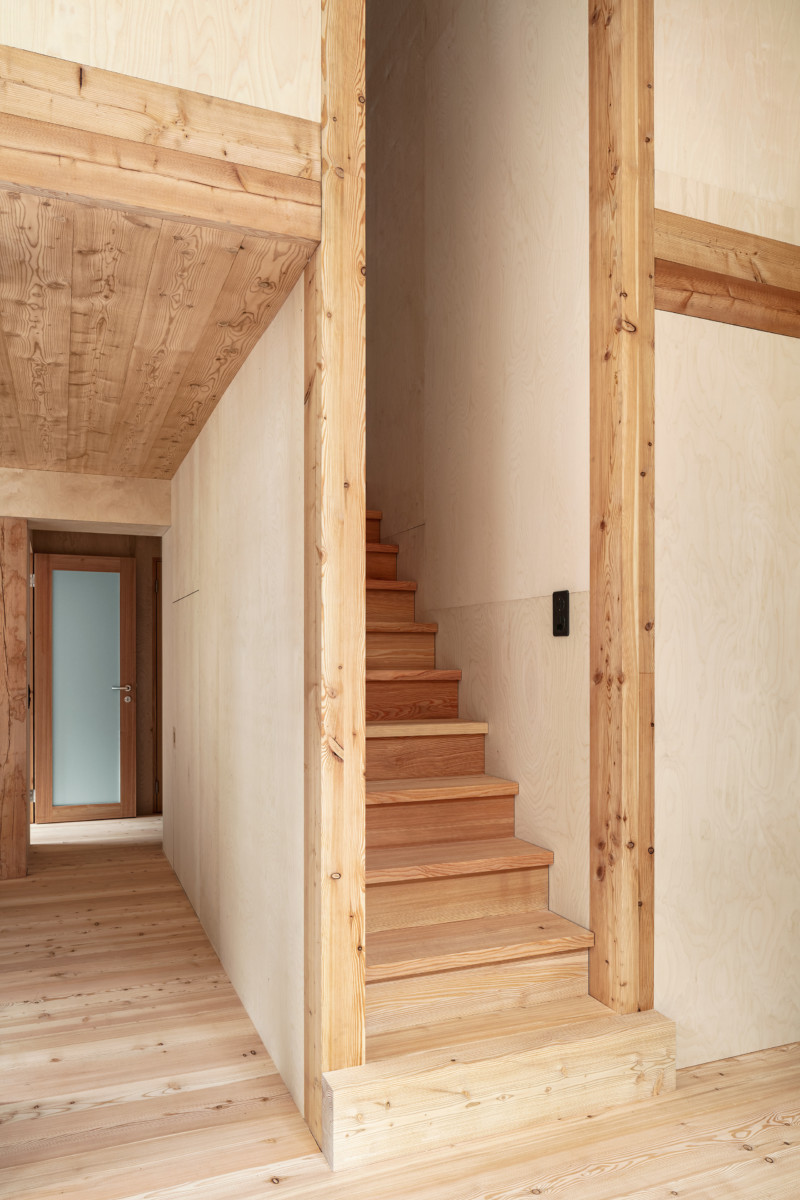 Die Doppel-Stallscheune liegt in Gluringen, in einem typischen Dorf im Hochtal Goms. Der alte Blockholzbau wurde mit einem Wohnblockteil im Heuraum-Geschoss ergänzt und kann neu als Wohnhaus genutzt werden. Der Haupteingang ist über die «Schir-Aussentreppe» erreichbar und bildet in einem kleinen Vorraum, der ursprünglich ist, einen kleinen Entréebereich. Der neu eingebaute Bauteil wurde in Holzbauweise umgesetzt. Als Kontrast zu der alten Blockwand in Lärche/Fichte wurden die Wände und Decken einheitlich mit edelfurniertem Birkensperrholz verkleidet. Die Böden sind mit einheimischen Lärchenriemen gefertigt. Das Dach wurde mit Mithilfe der Eigentümer mit handgespaltenen Lärchenschindeln eingedeckt. Sämtliche Oberflächen sind unbehandelt.