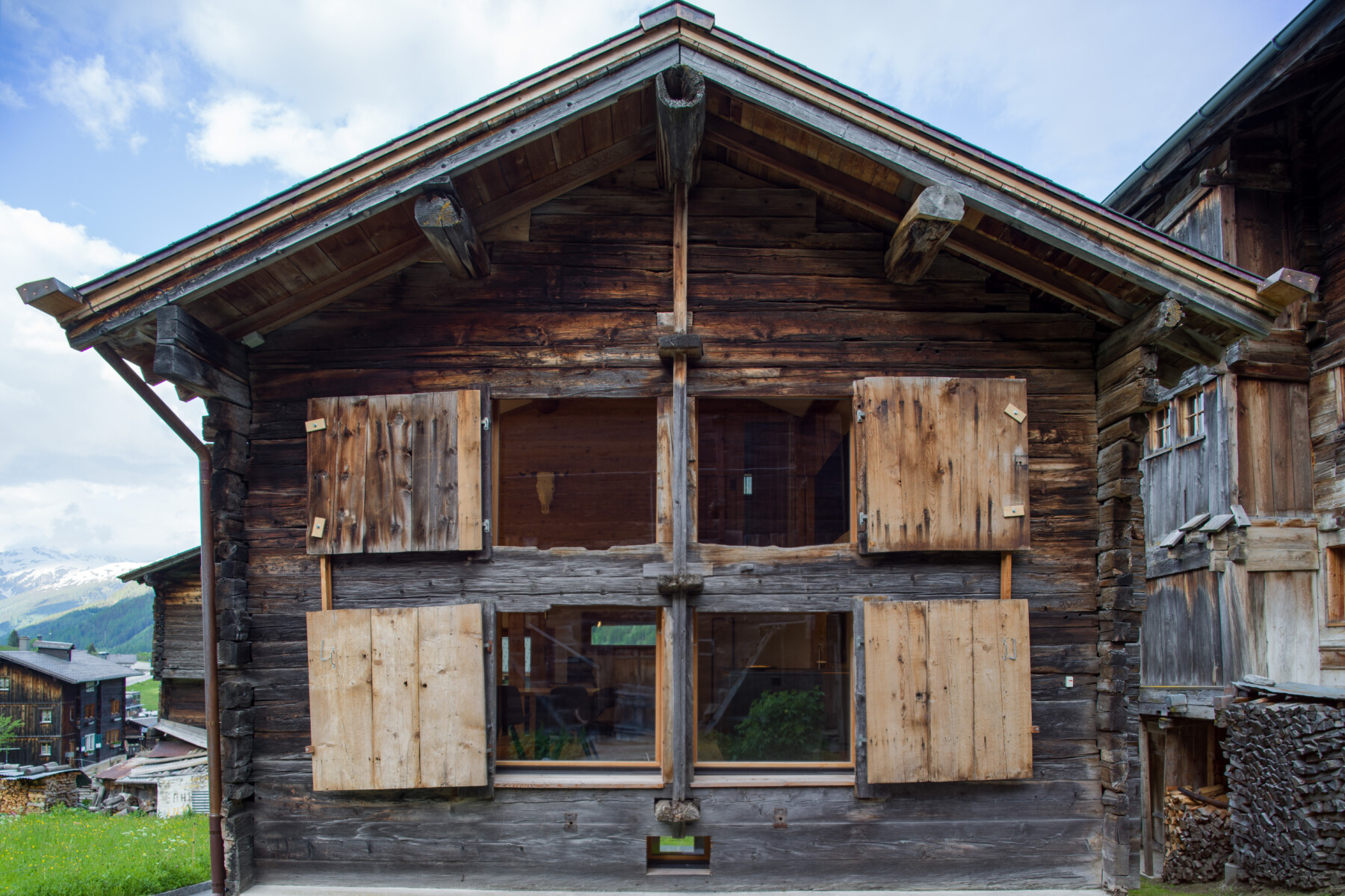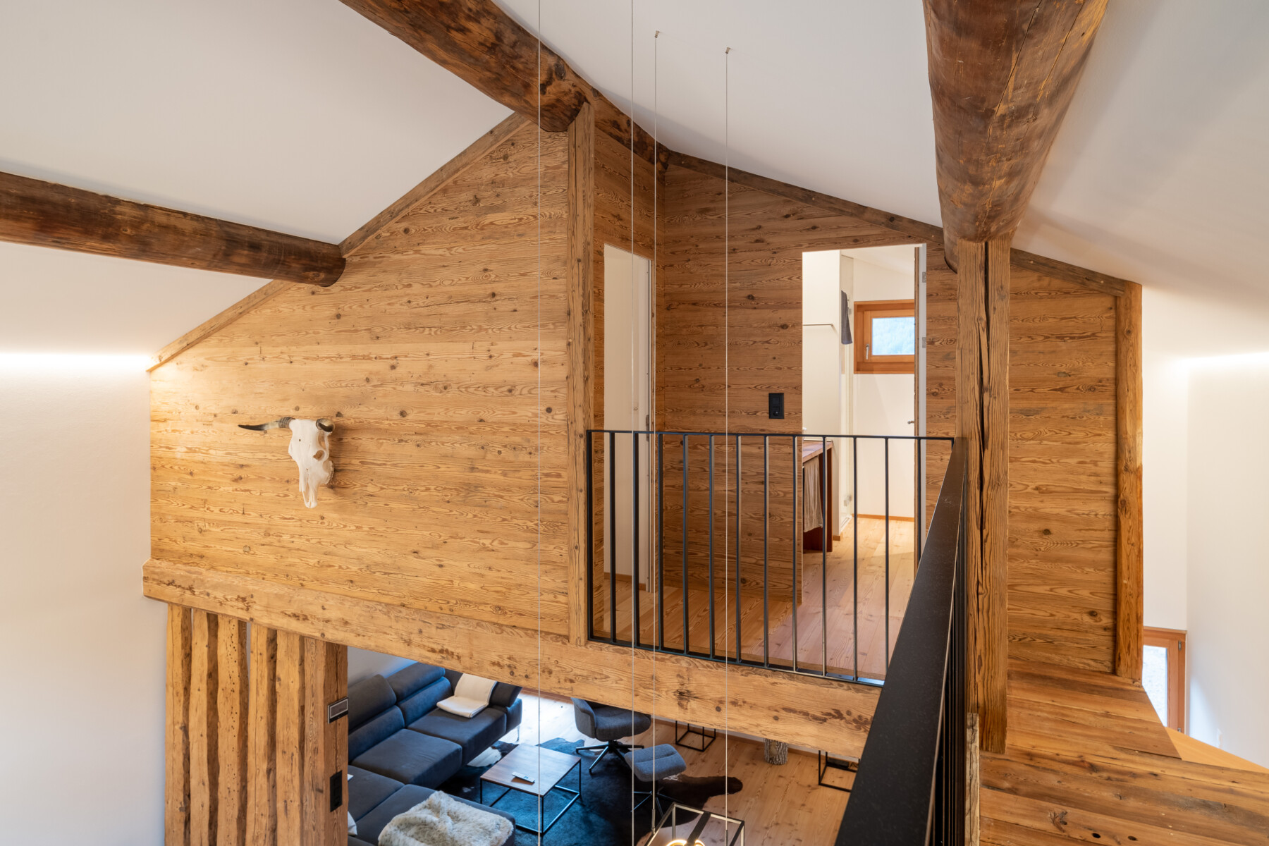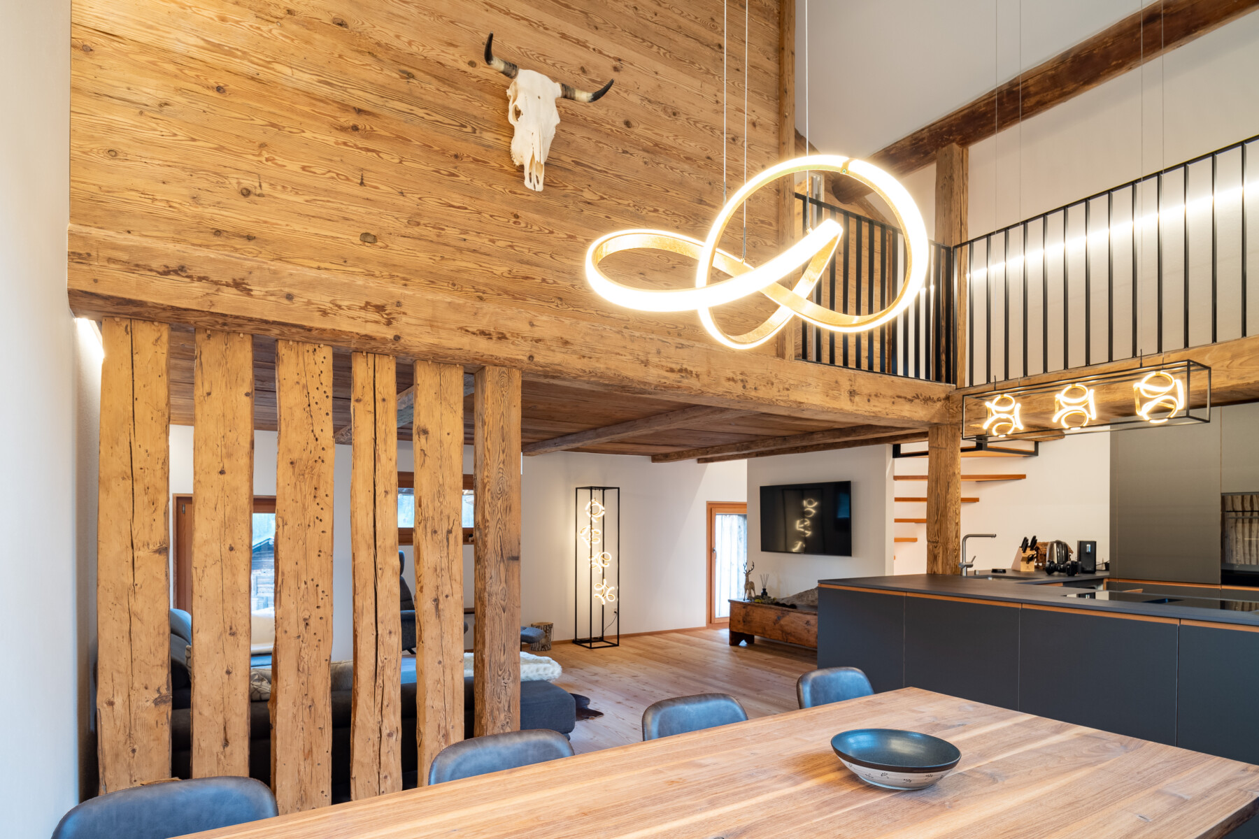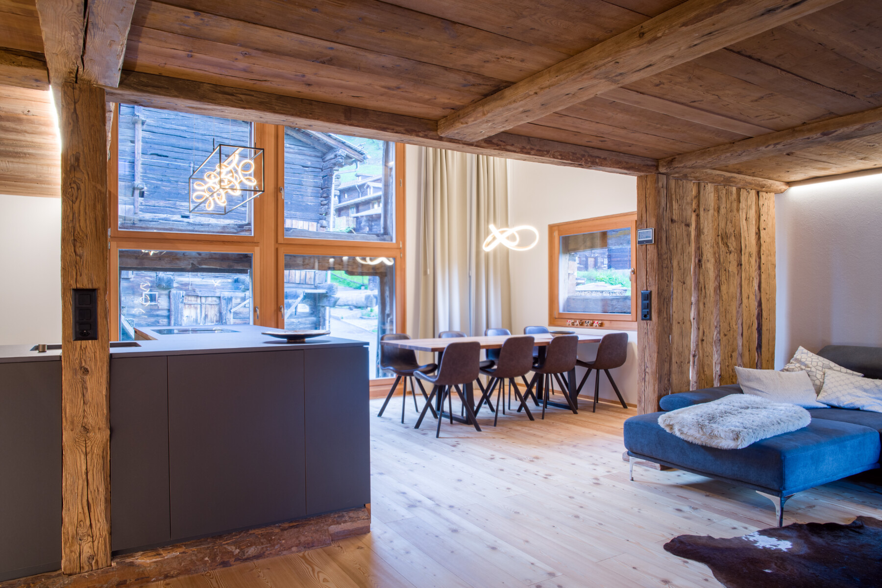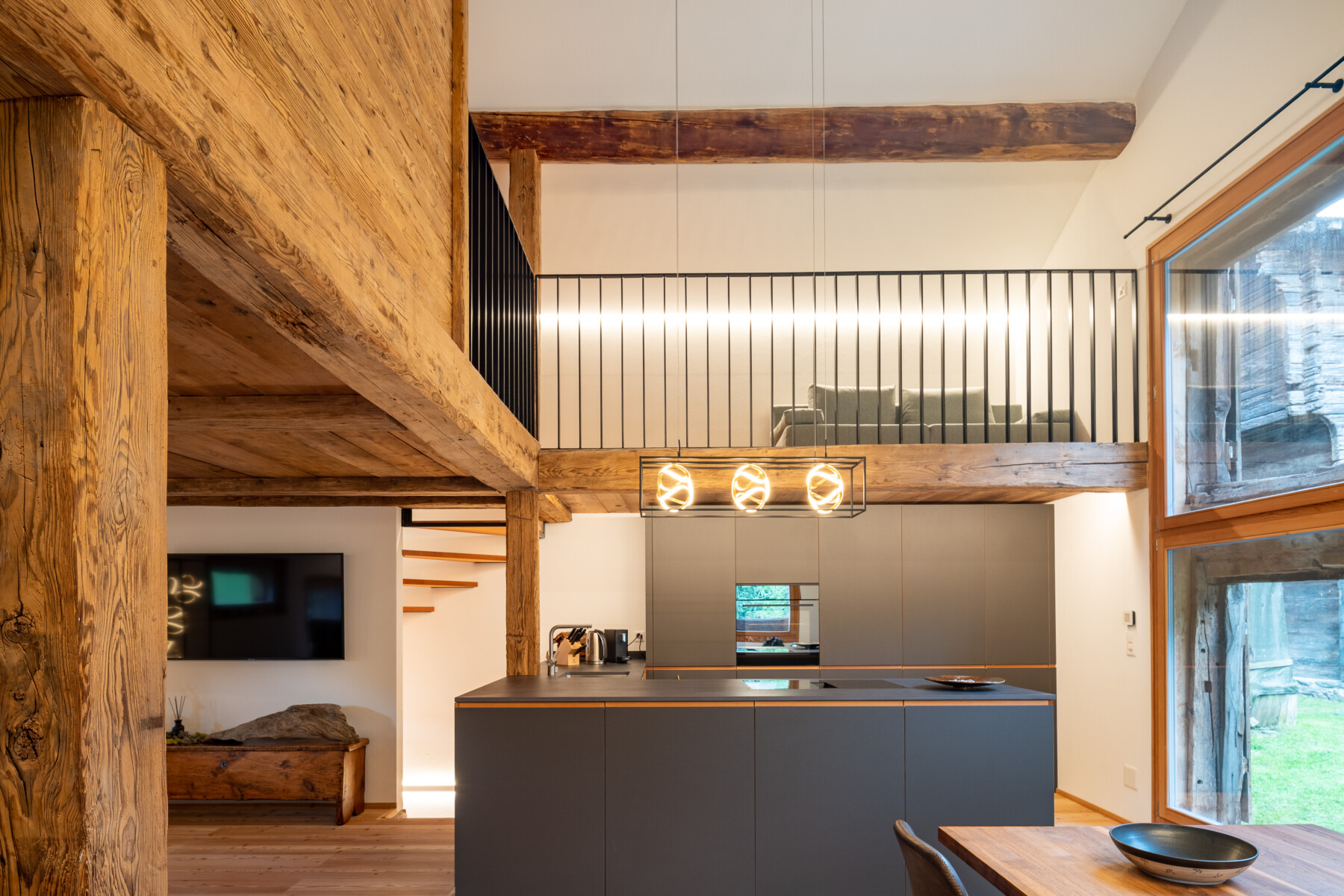 Betonmauerwerk, Altholz Lärche, Innenausbau Eiche massiv und furniert, Sumpfkalk, Linoleum Desktop