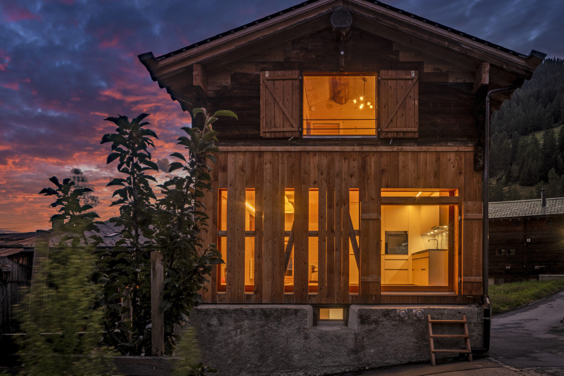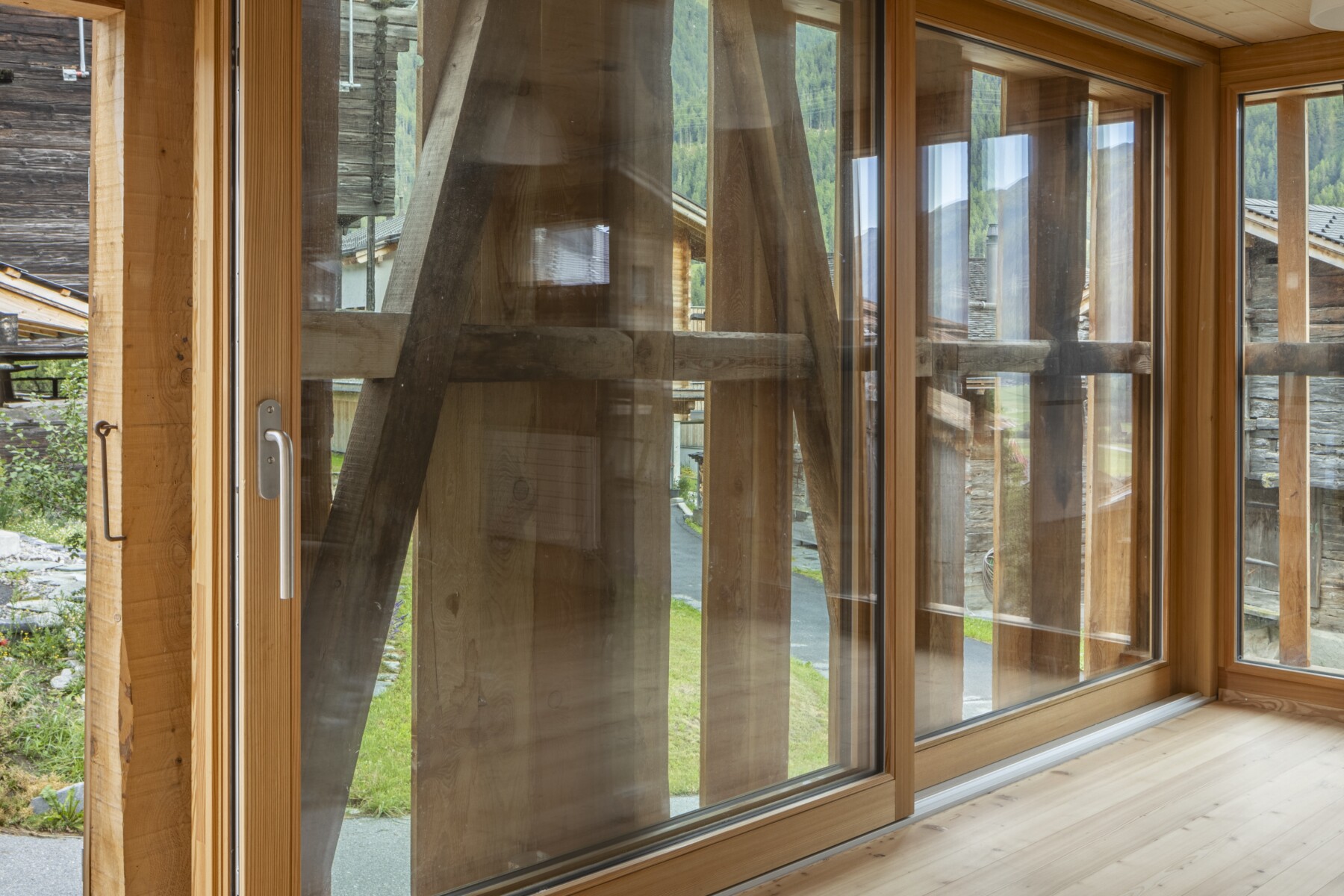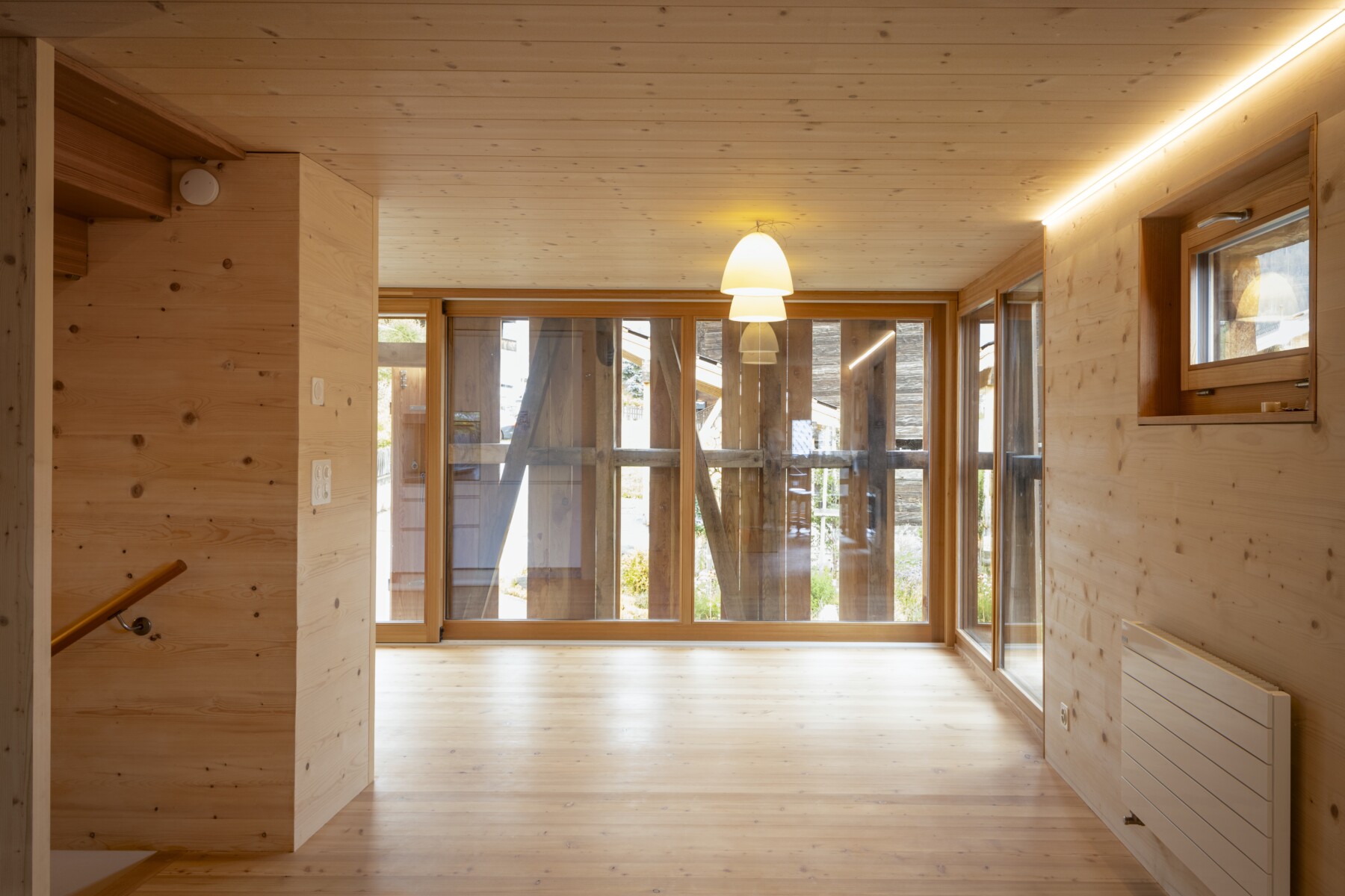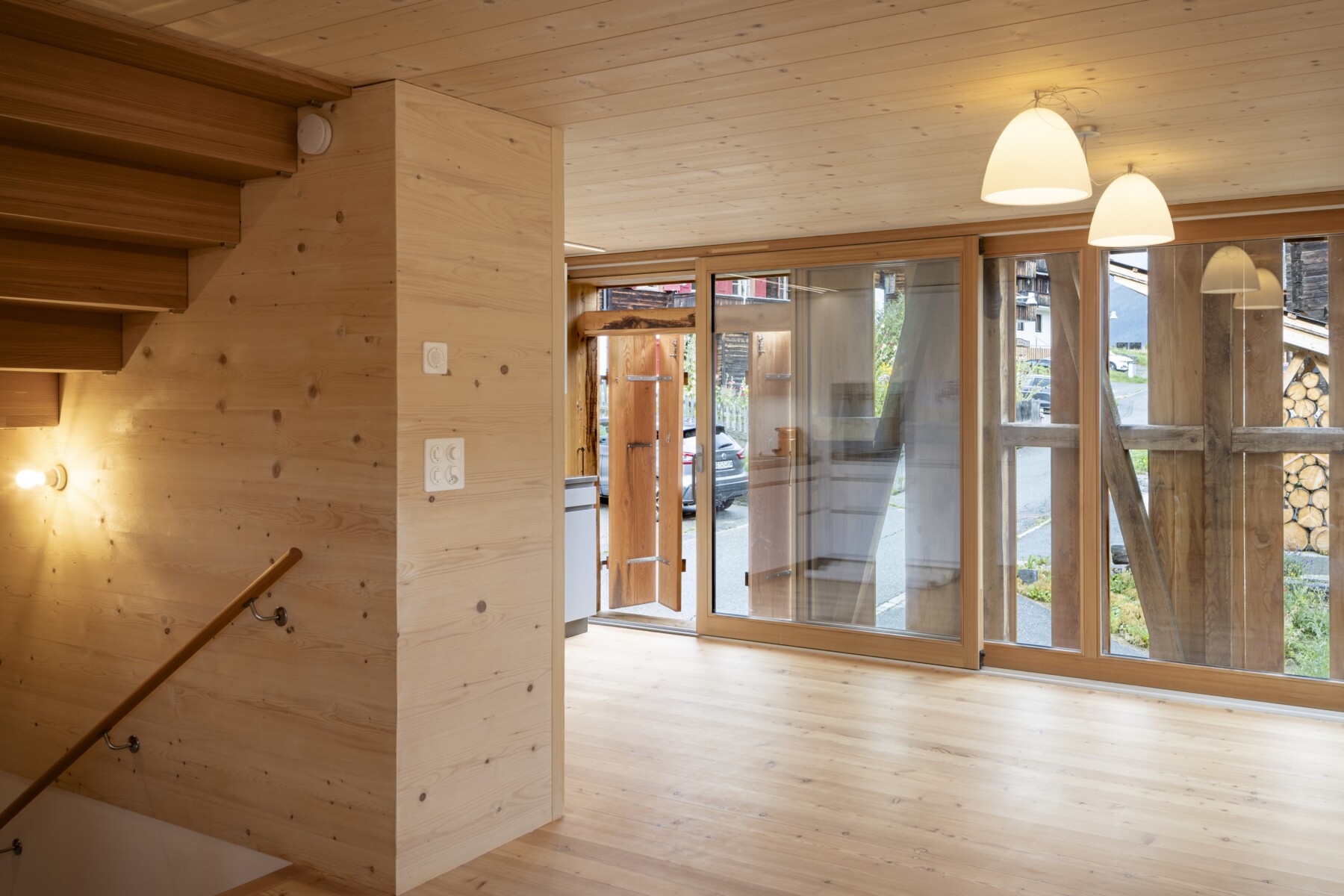 Betonmauerwerk, Altholz Lärche, Innenausbau Lärche - Fichte massiv - furniert, Sumpfkalk