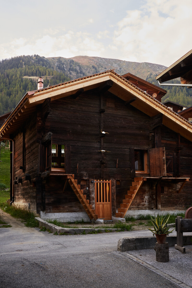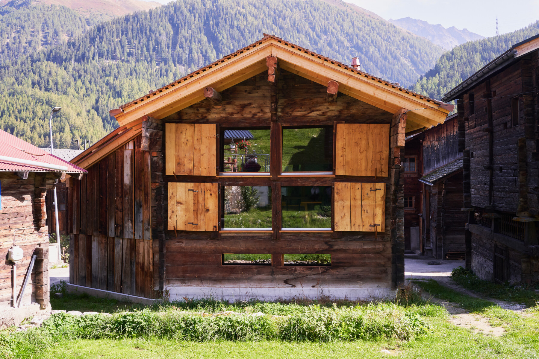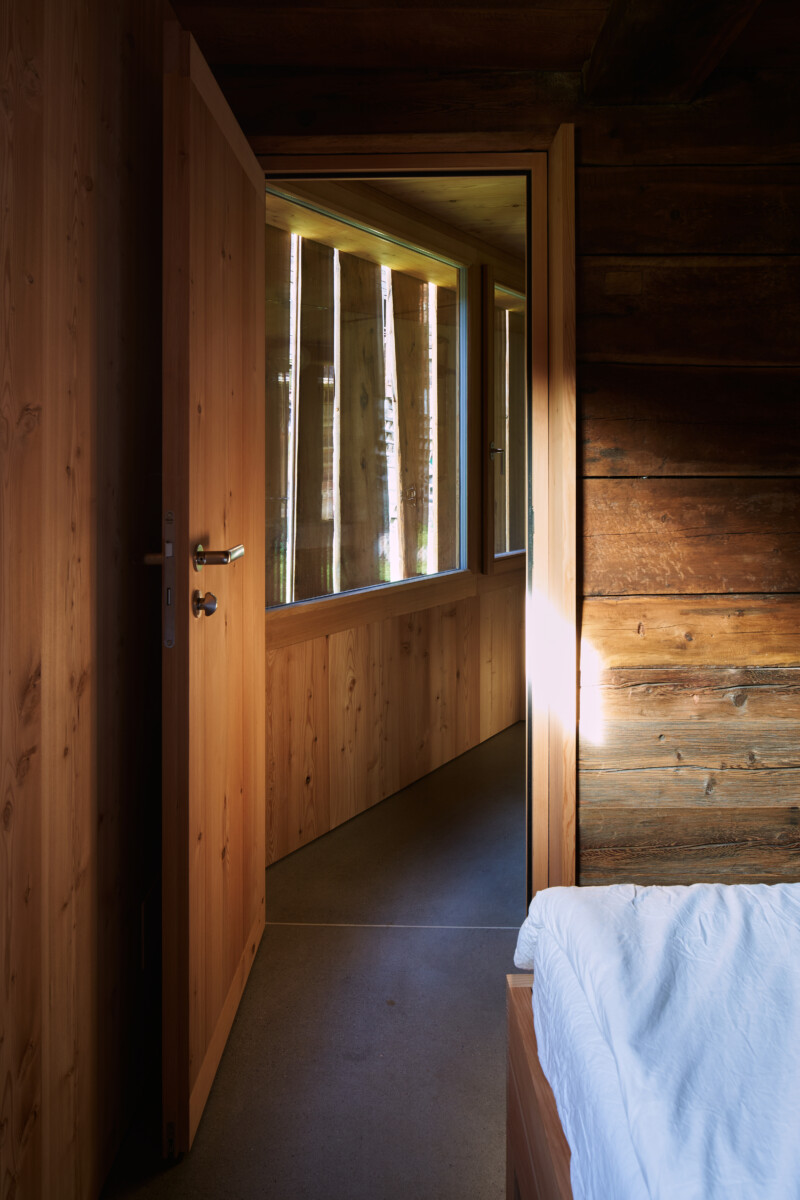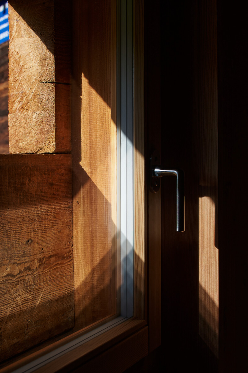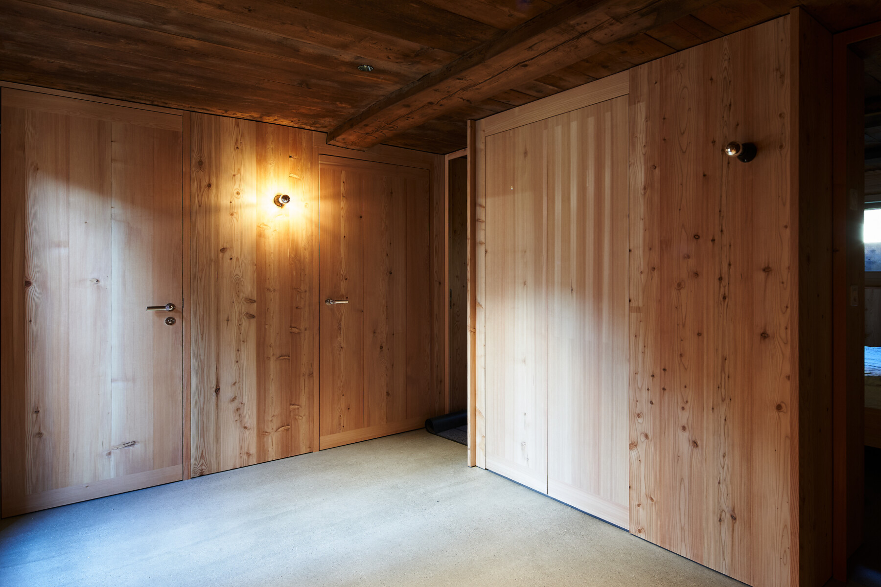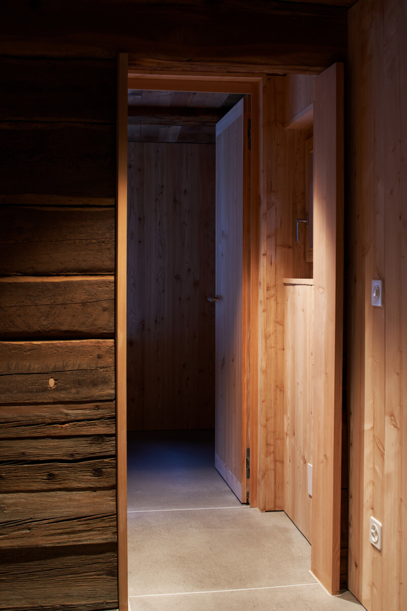 Betonmauerwerk, Altholz Lärche, Schindeln in Lärche, Innenausbau Lärche massiv und furniert, Altholz Fichte, Anhydrit eingefärbt