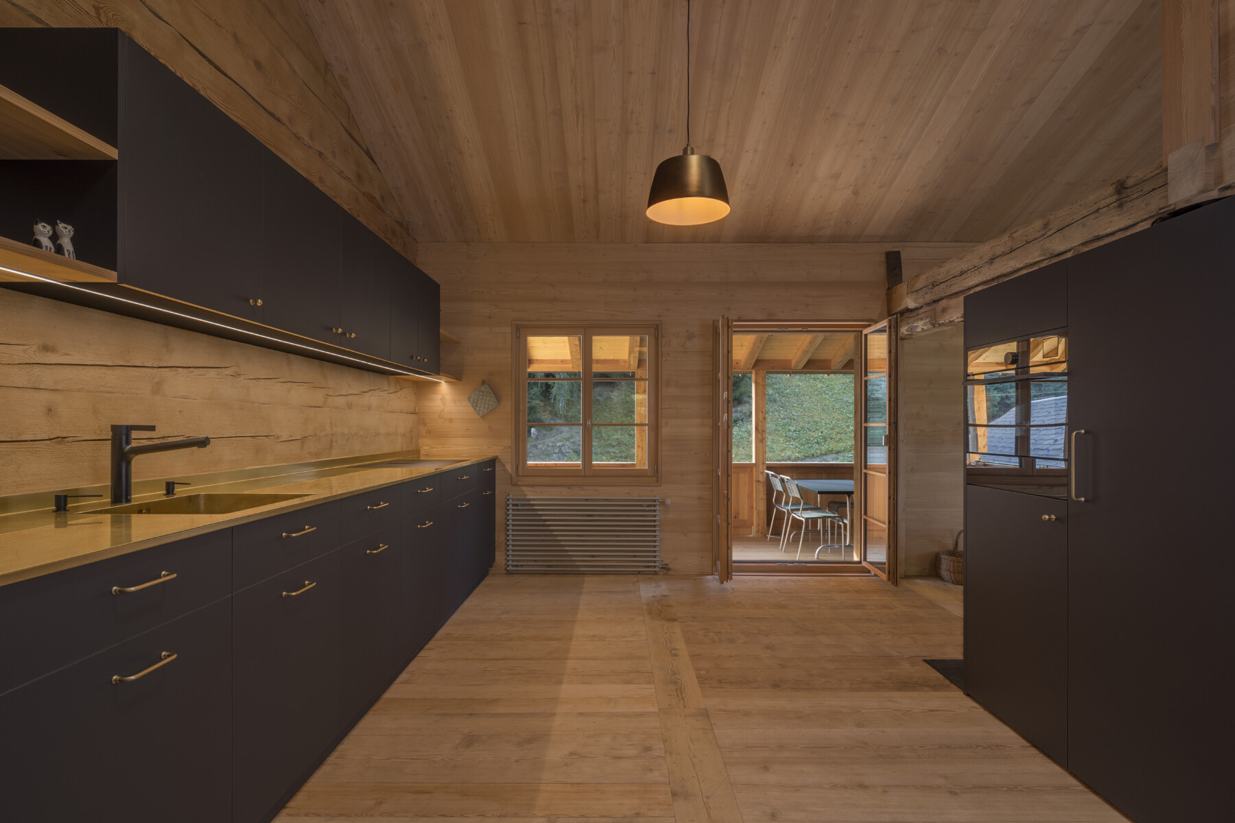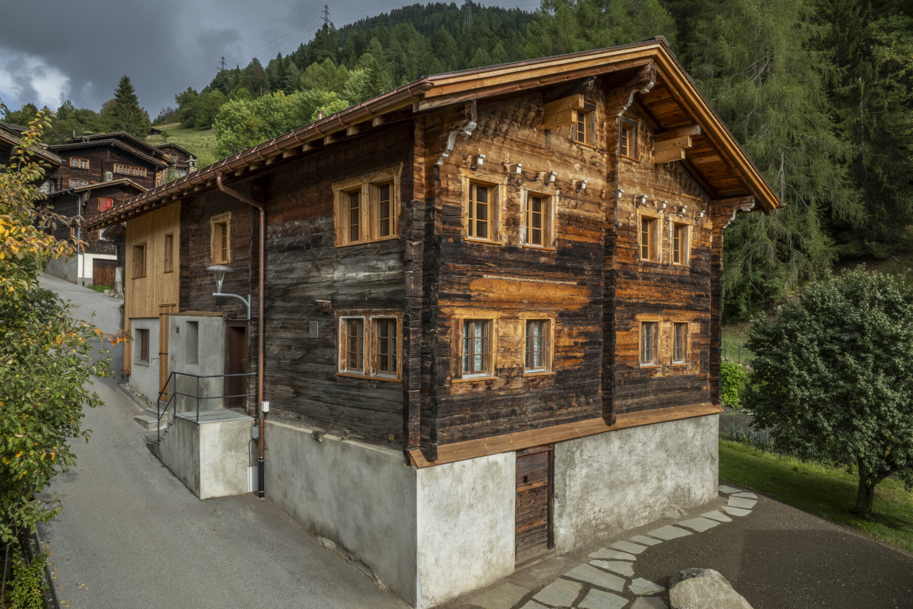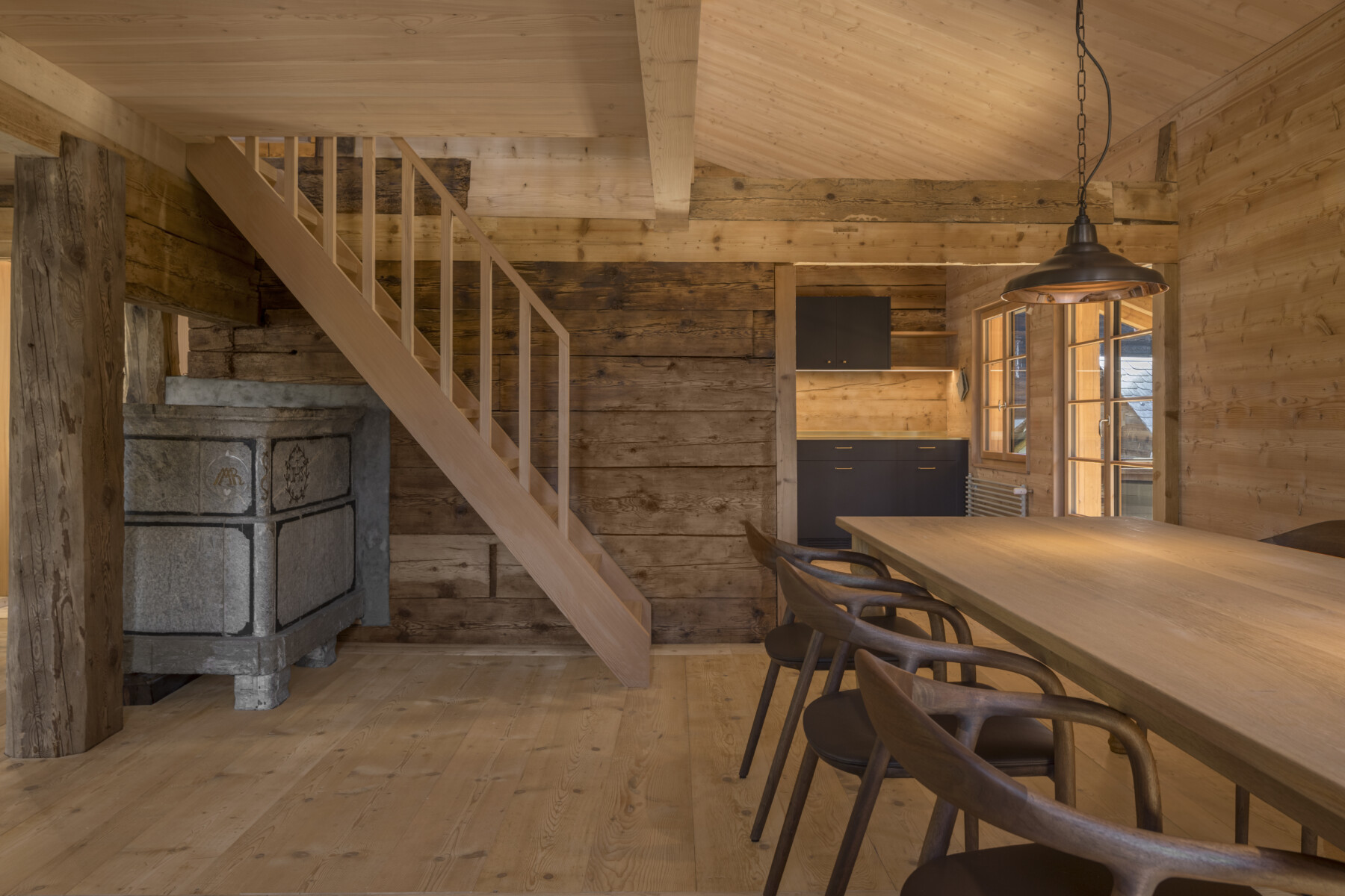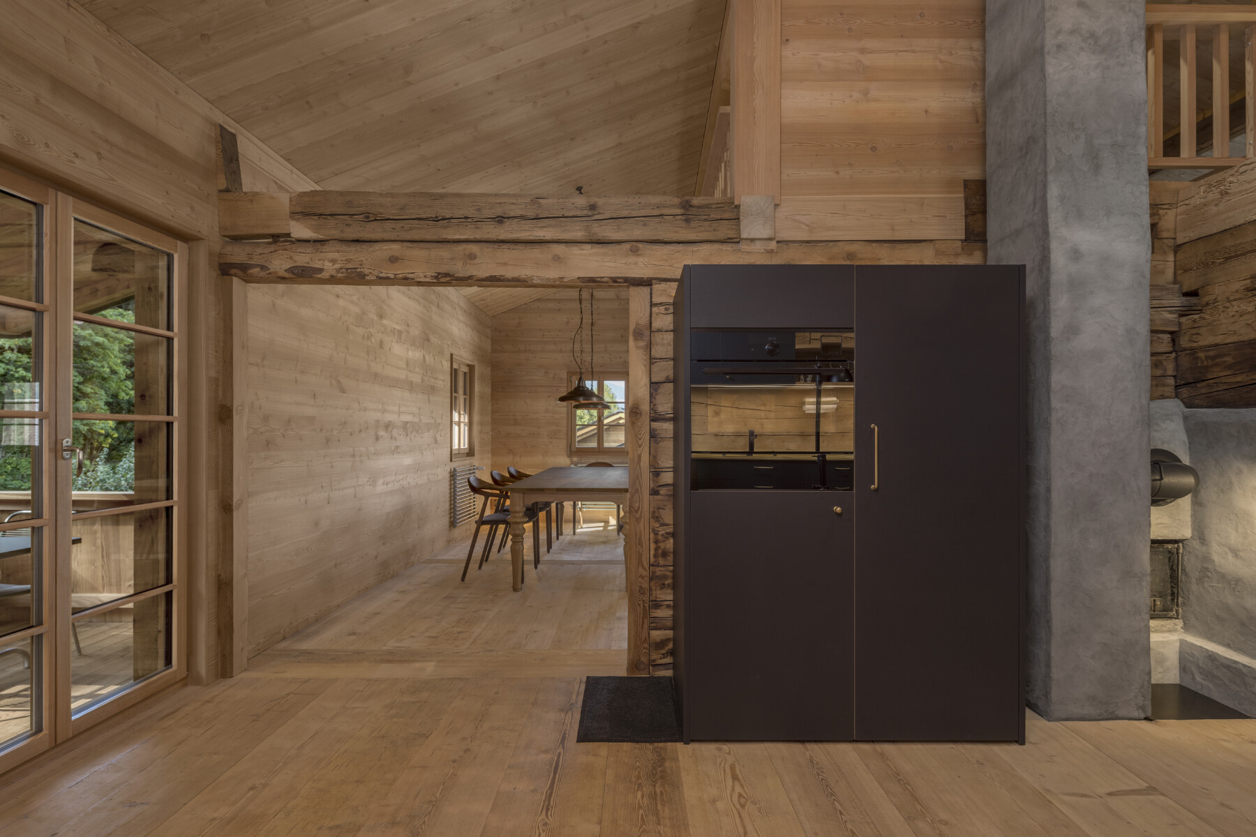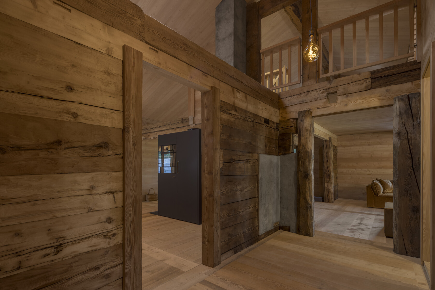 Altholz-Blockwände, Laube-Fassade Lärche, Innenausbau Fichte-Lärche massiv, Bodenriemen Altholz (Bestand)